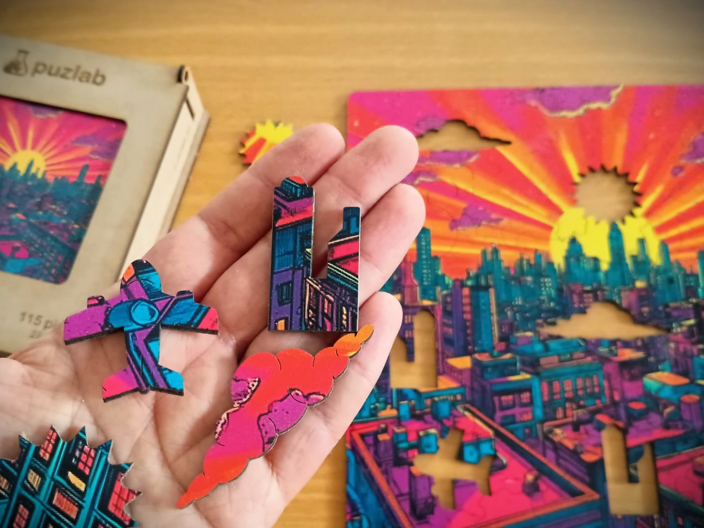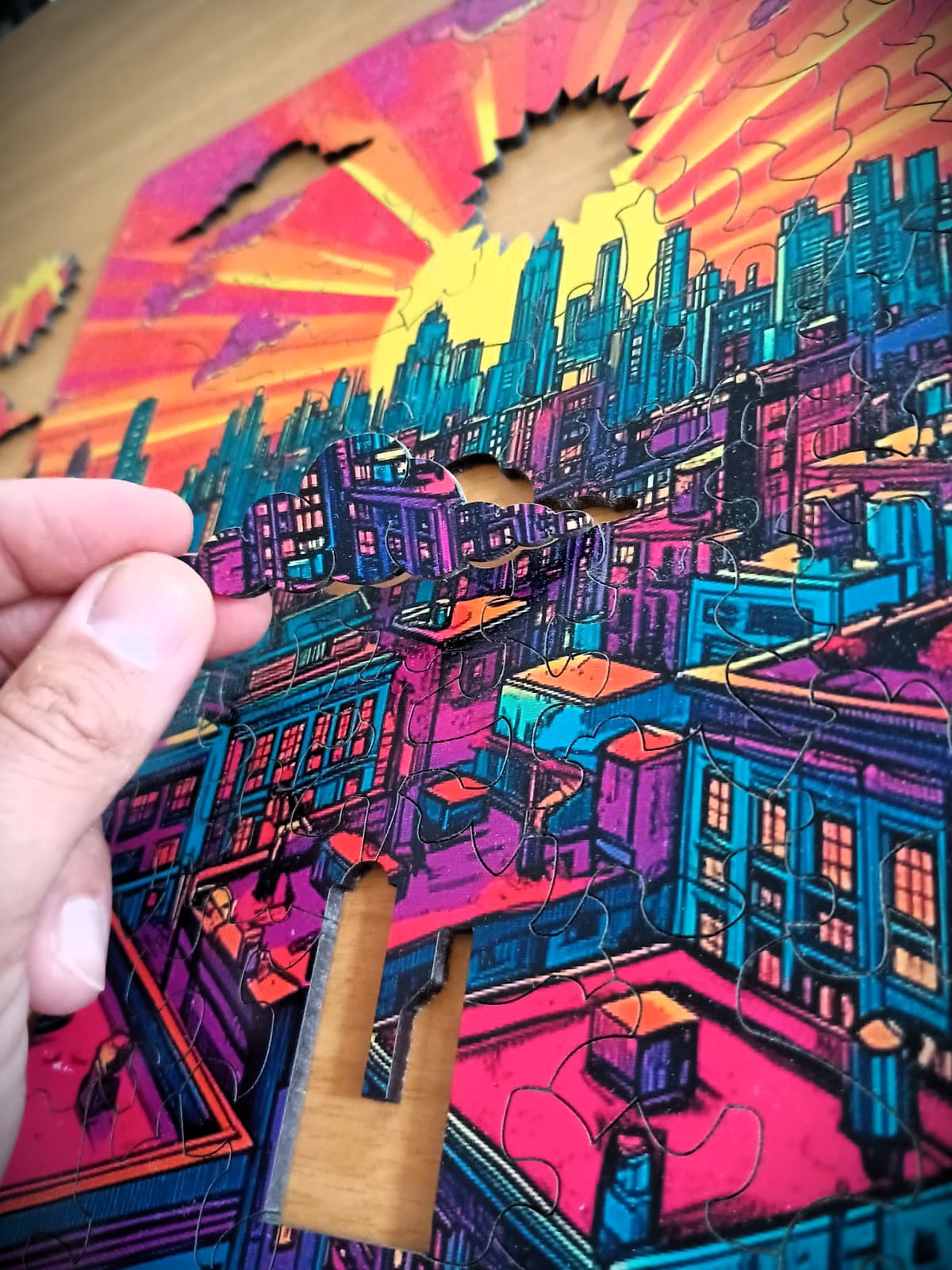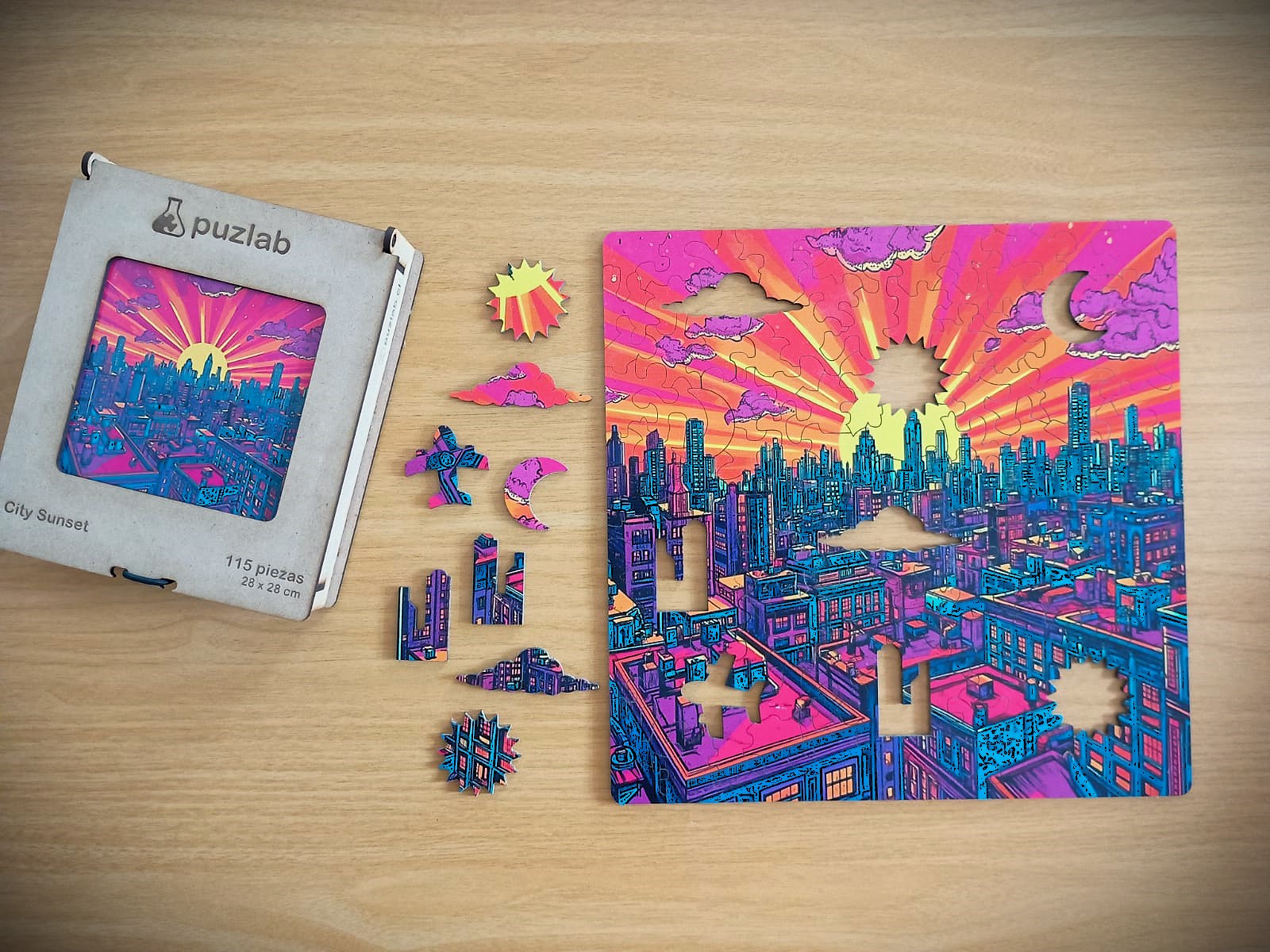 Incluye piezas de corte especial —sol, luna, estrellas, edificios y formas urbanas— que lo hacen mucho más entretenido que un rompecabezas tradicional y perfecto para quienes aman los desafíos visuales y el arte moderno.