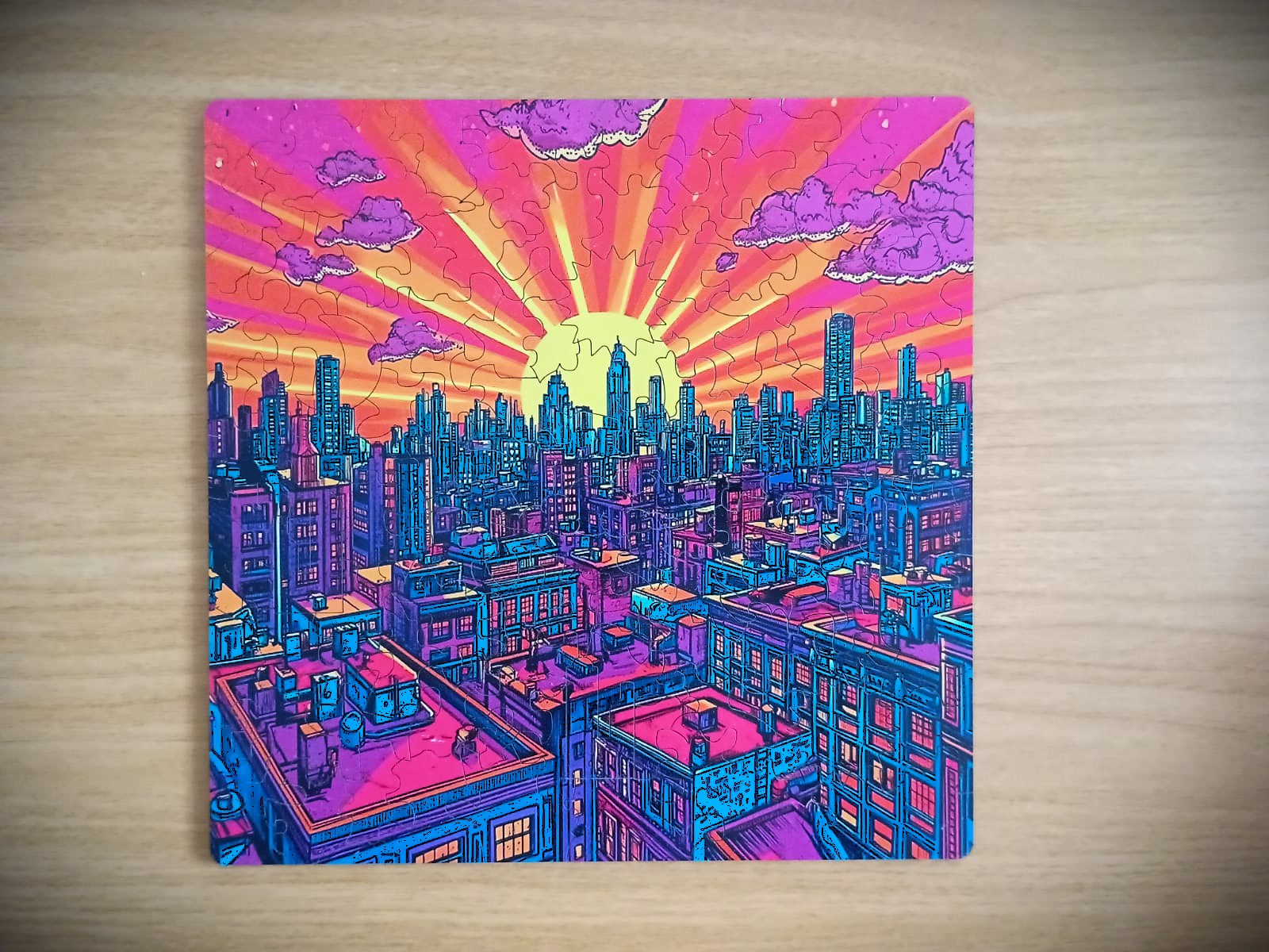 City Sunset es un puzle explosivo en color, con un atardecer neón que ilumina una ciudad futurista llena de detalles. El contraste entre el cielo rosado-naranja y los edificios en tonos azules y morados convierte esta escena en una obra increíblemente vibrante.